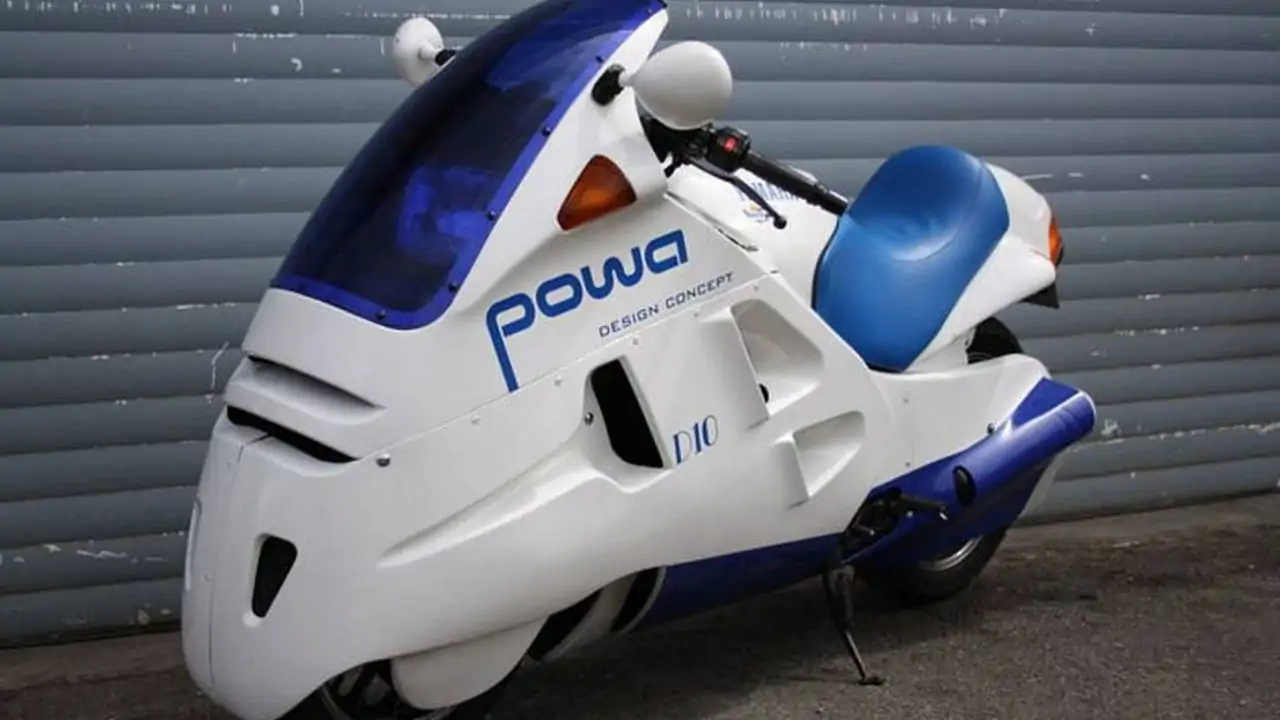 Well, this is just about one of the coolest motorcycles I've ever been able to share, and I didn't even know it existed until a reader sent it over. Based on a Yamaha FZ750, this is the D10, a futuristic concept bike designed by a Swiss company called Moko/Powa Design. According to the seller, only ten examples were made and this is one of just six that remain.