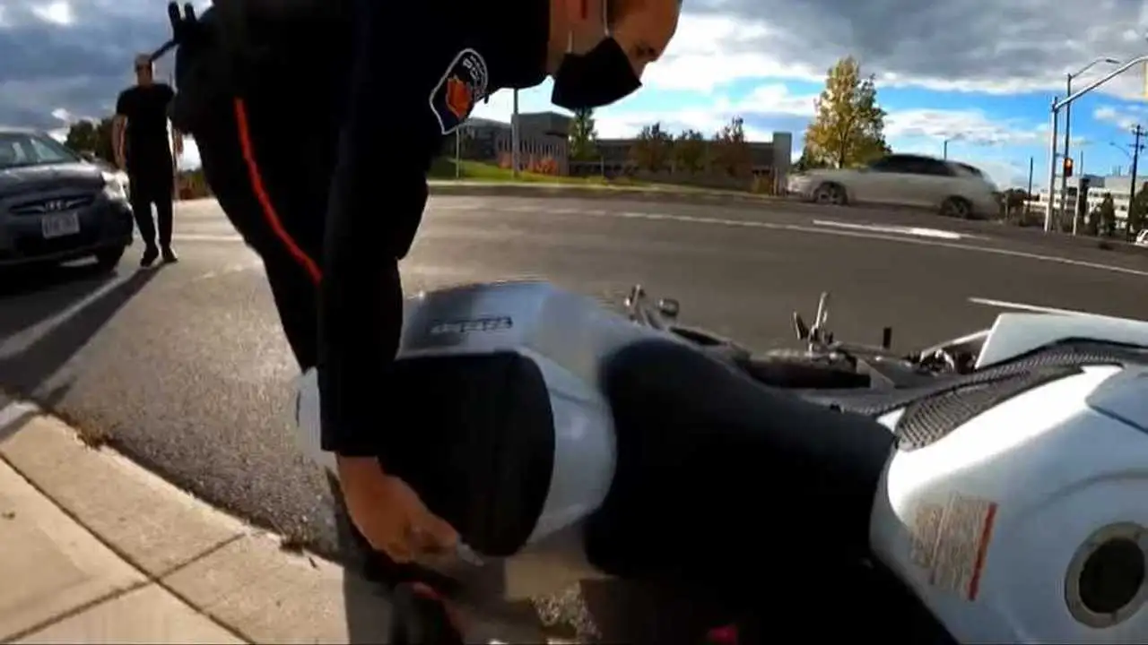 As the video posted to the East End Hamilton Neighbourhood Watch Facebook group begins, Kyle Wilde was stopped at a red light on his Suzuki, talking to his camera while recording a motovlog. Suddenly the unidentified officer tackled Wilde, telling him "Get off the bike, get off the bike" and pulling him to the side of the road. The bike fell over on its right side. The officer immediately handcuffed Wilde, who was confused but fully compliant with police.